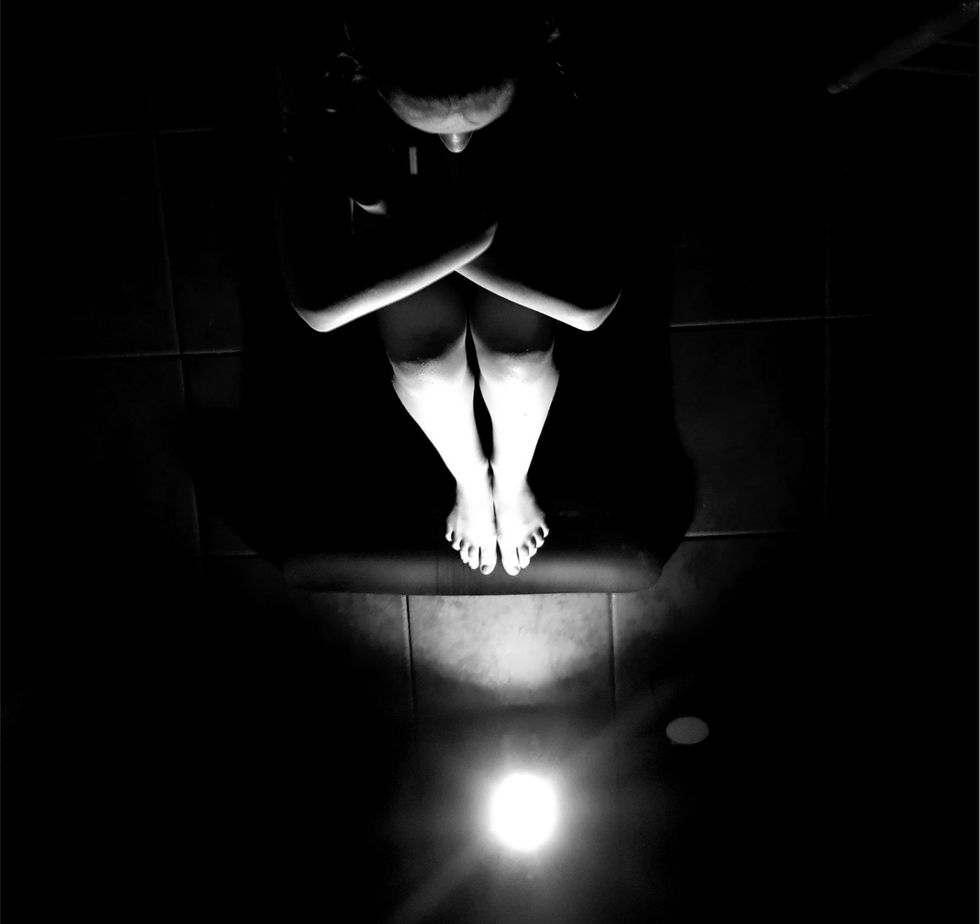 I took these photos in a completely blacked out room at night, creating a pitch black atmosphere. The light is used was a phone on the lowest setting to make the light as direct and contained as possible. I then switched my phone to a black and white setting.